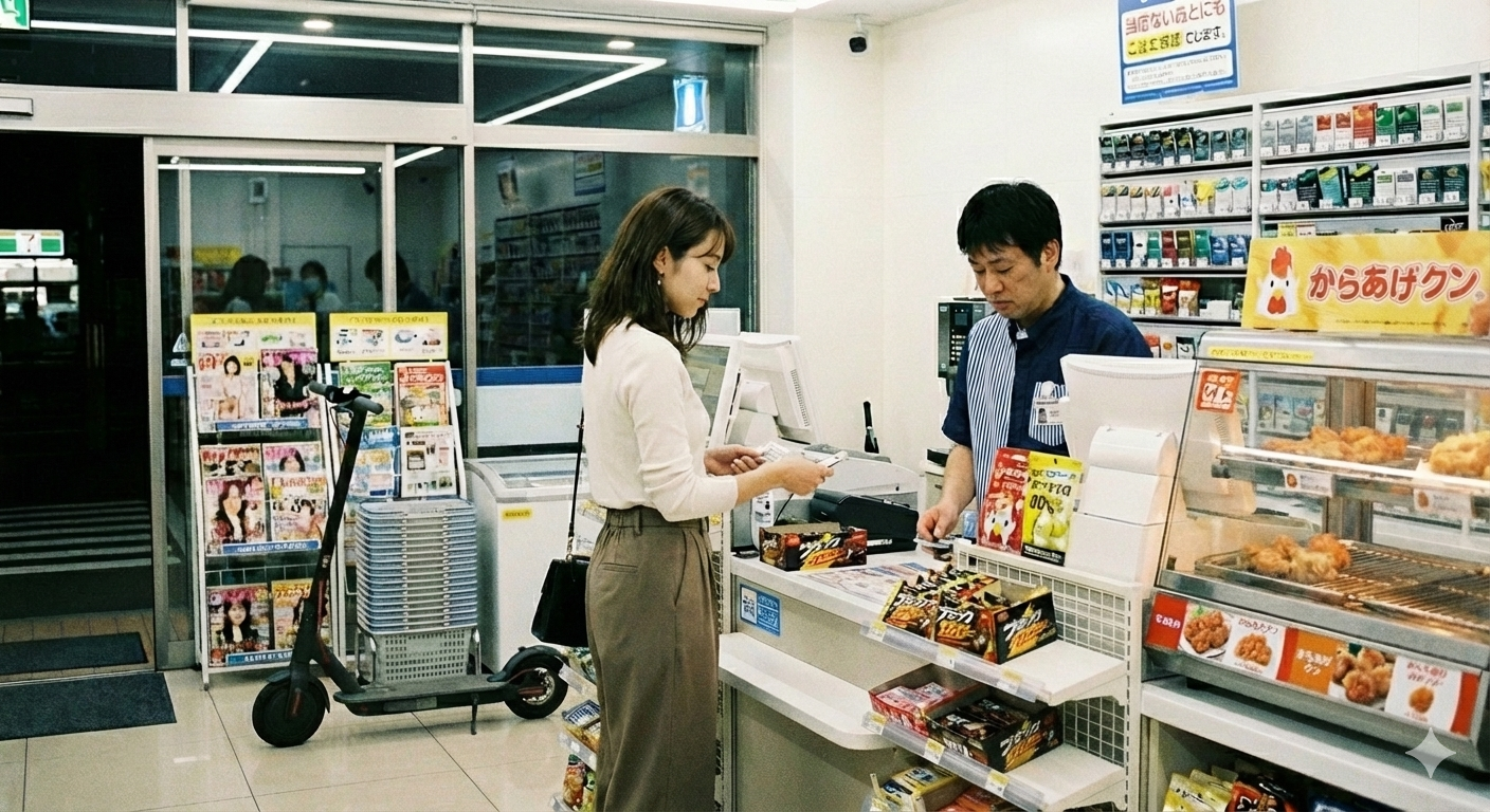 キックボードの小さな車輪が、ローソン店内の床を「カタタッ」と鳴らした。
